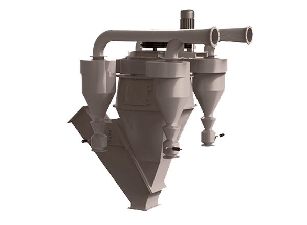 V型打散选粉区,设置多层打散、分级板,反复打散、吹离,使所排出粗粉中几乎无细粉,沉降分级区中粉出料口有气流再次将中料中细粉吹走,中料中的细粉含量也大大减少,笼形转子分级区增加了倒流板,分级更加精准、有效。